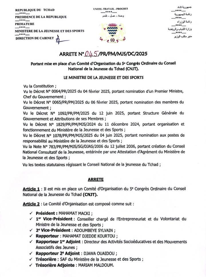 Par l’arrêté n°045/PR/PM/MJS/DC/2025, signé le 20 juin 2025, le ministre de la Jeunesse et des Sports, M. Maïdé Hamit Lony, a institué un comité d’organisation en vue de la tenue du 5ᵉ congrès ordinaire du Conseil National de la Jeunesse du Tchad.