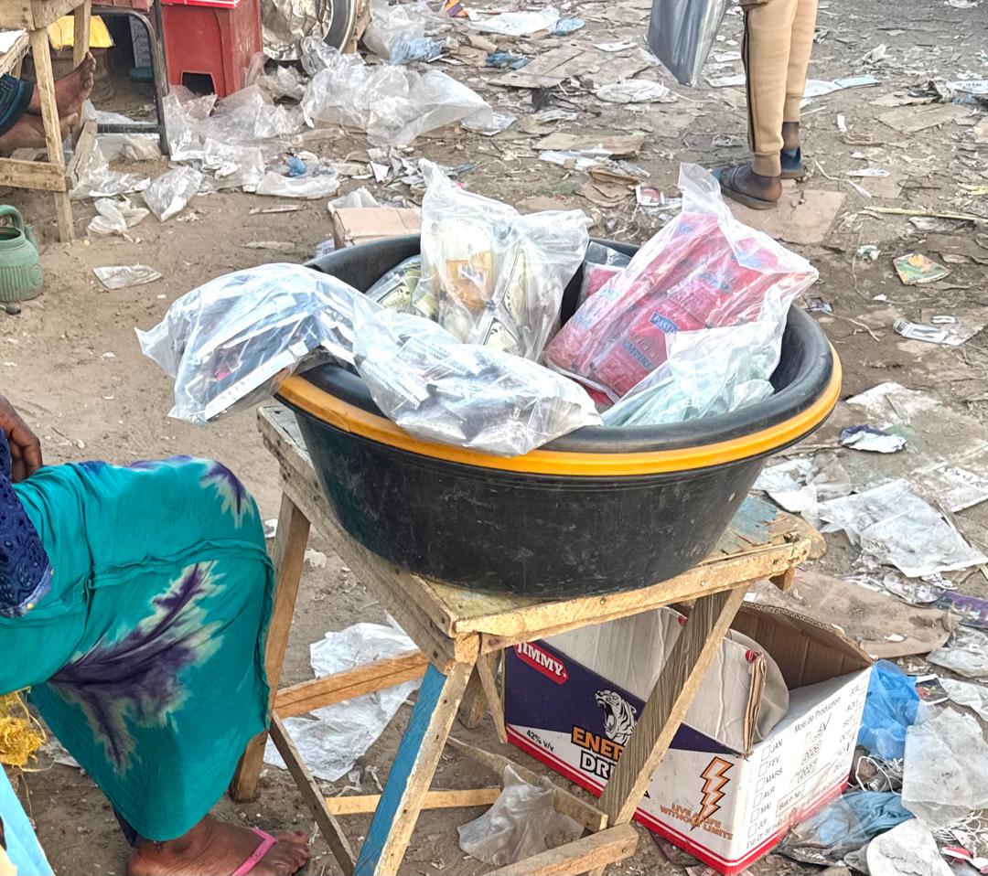 Ce dimanche 30 novembre 2025, aux alentours de 10h, un groupe de jeunes, installés à l’entrée en face de l’échangeur du marché de Dembé, discute avec une vendeuse de ces sachets prohibés. Juste à côté, des stocks entiers s’entassent dans des sacs, cartons, bassins et seaux. Un peu plus loin, d’autres jeunes, visiblement épuisés, se font servir la liqueur dans des bidons en tangui.