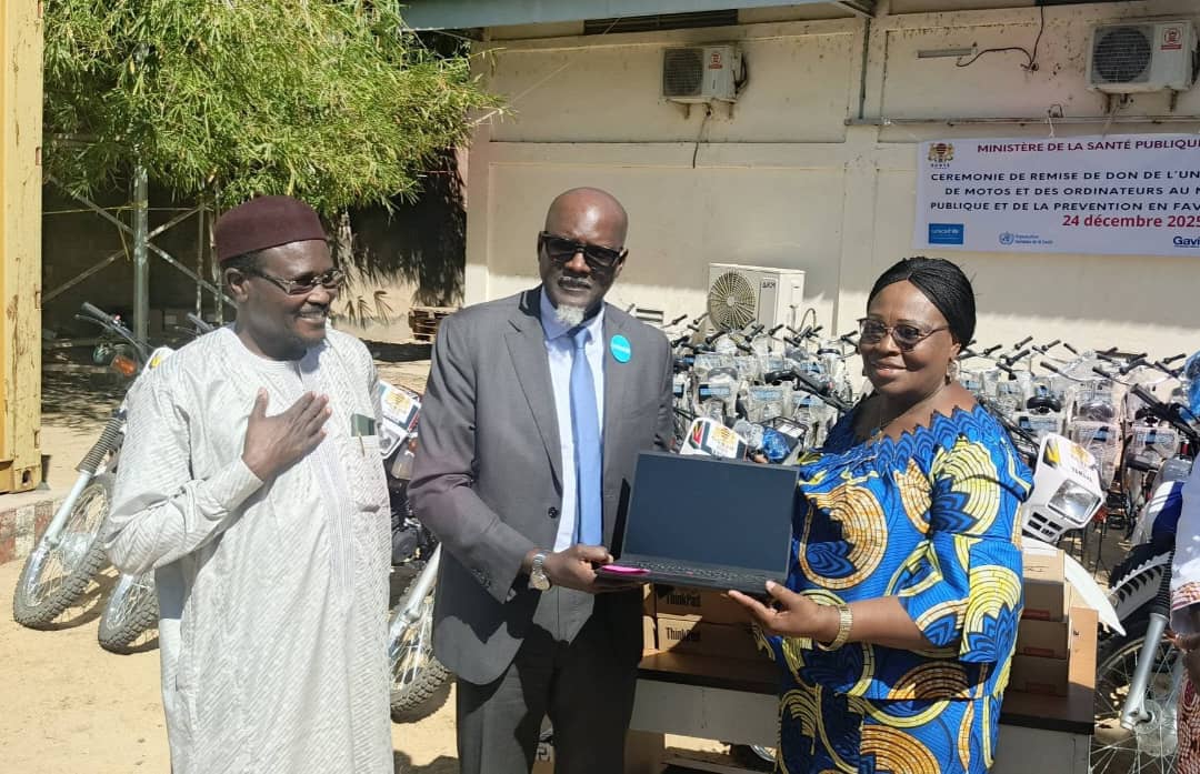 La Secrétaire générale du ministère de la Santé publique et de la Prévention, Dr Toralta Nodjitoloum Joséphine, a réceptionné ce jeudi 24 décembre 2025 un important lot de matériel roulant et informatique offert par l’UNICEF. Ce don est destiné à appuyer la Direction de la vaccination, de la lutte contre la maladie et de la surveillance épidémiologique.