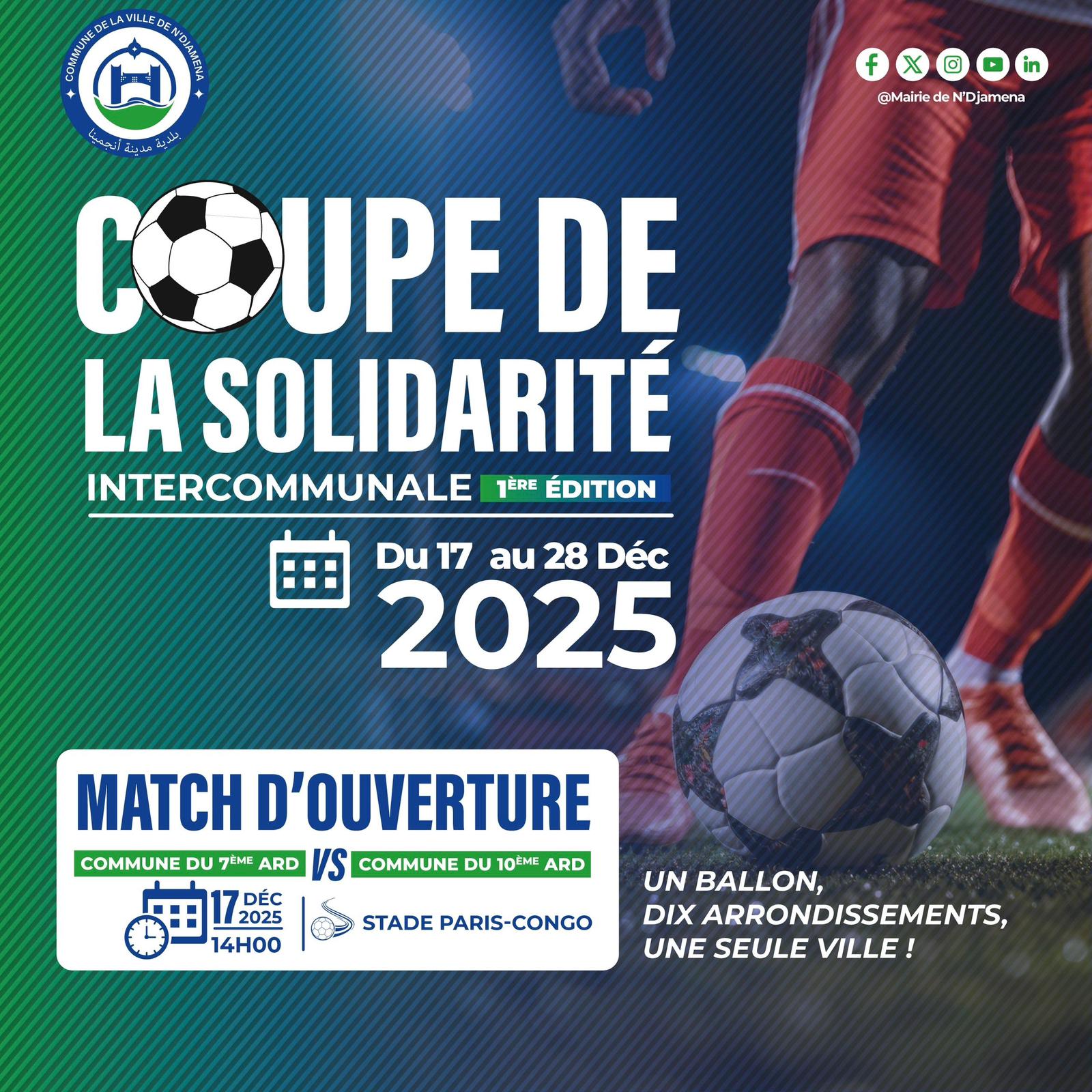 La Commune de la Ville de N’Djamena lance, du 17 au 28 décembre 2025, la toute première édition de la Coupe de la Solidarité Intercommunale, un rendez-vous sportif inédit qui réunira les dix arrondissements de la capitale autour des valeurs de cohésion, de fraternité et de fair-play.